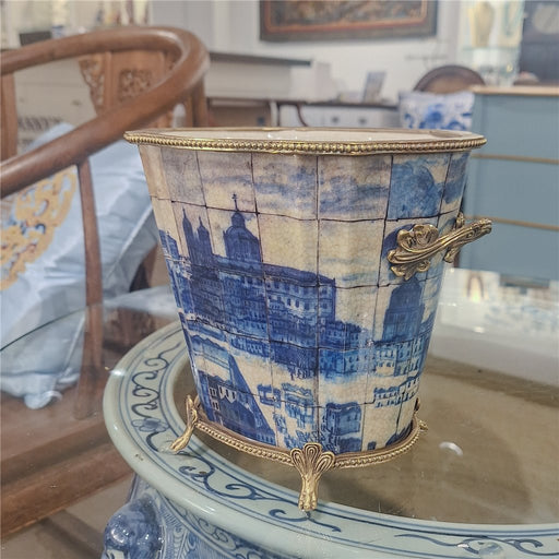 View Full DetailsBlue & White Village Scene Cachepot Planter-Porcelain & Bronze