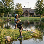 Bring a peaceful sense of nostalgia to your outdoor space with this charming bronze sculpture of a young boy sitting on a tree stump while fishing. Capturing a quiet moment of patience and simplicity, this timeless piece evokes the calm joy of childhood days spent outdoors.