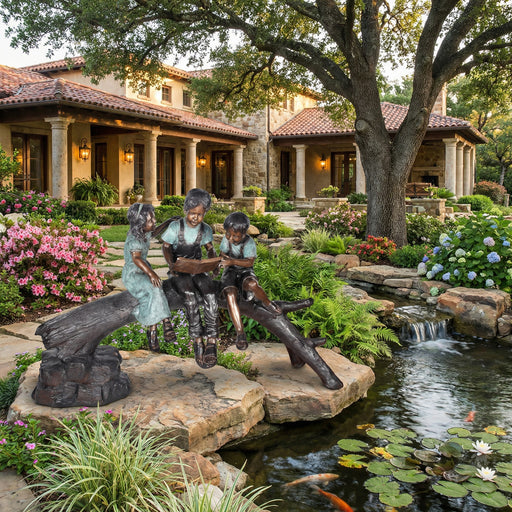 View Full DetailsThree Kids Reading Book on Log Bronze Sculpture