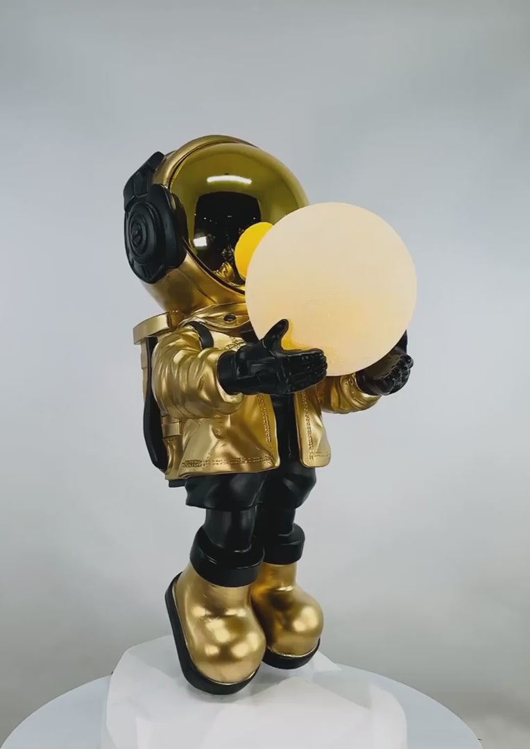 This striking table lamp merges artistic expression with practical illumination, featuring a whimsical pop art astronaut rendered in gleaming gold finish. The sculptural design brings contemporary flair to any space, transforming your room with its bold, imaginative aesthetic. Perfect for collectors and design enthusiasts seeking a statement piece that doubles as functional lighting, this lamp celebrates the intersection of fine art and everyday utility.