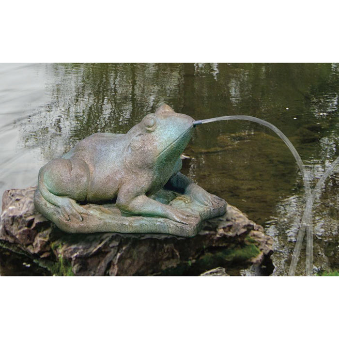 Elevate your aquatic landscape with this exquisite cast stone frog spitter. Effortlessly integrate this refined water feature into your existing pond ecosystem by connecting it to a fountain pump, creating a distinguished ambiance that reflects discerning taste.
